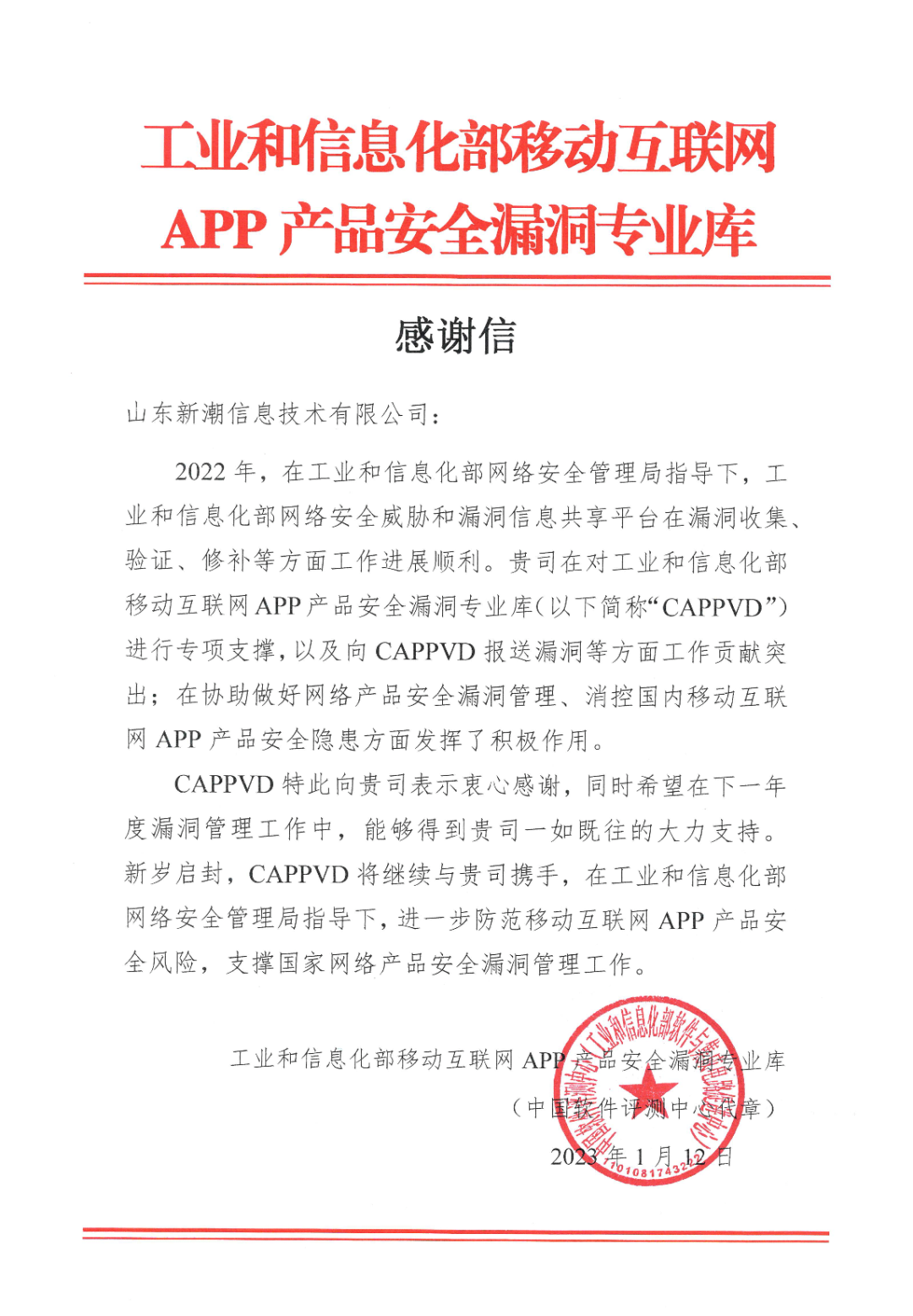 近日,工業(yè)和信息化部移動互聯(lián)網(wǎng)APP產(chǎn)品安全漏洞專業(yè)庫(以下簡稱“CAPPVD漏洞庫”)向山東新潮信息技術(shù)有限公司發(fā)來感謝信,這是對山東新潮信息參與移動互聯(lián)網(wǎng)APP產(chǎn)品安全漏洞管理系列工作的高度認(rèn)可與感謝,并期望在下一年共同攜手支撐國家網(wǎng)絡(luò)產(chǎn)品安全漏洞管理工作。