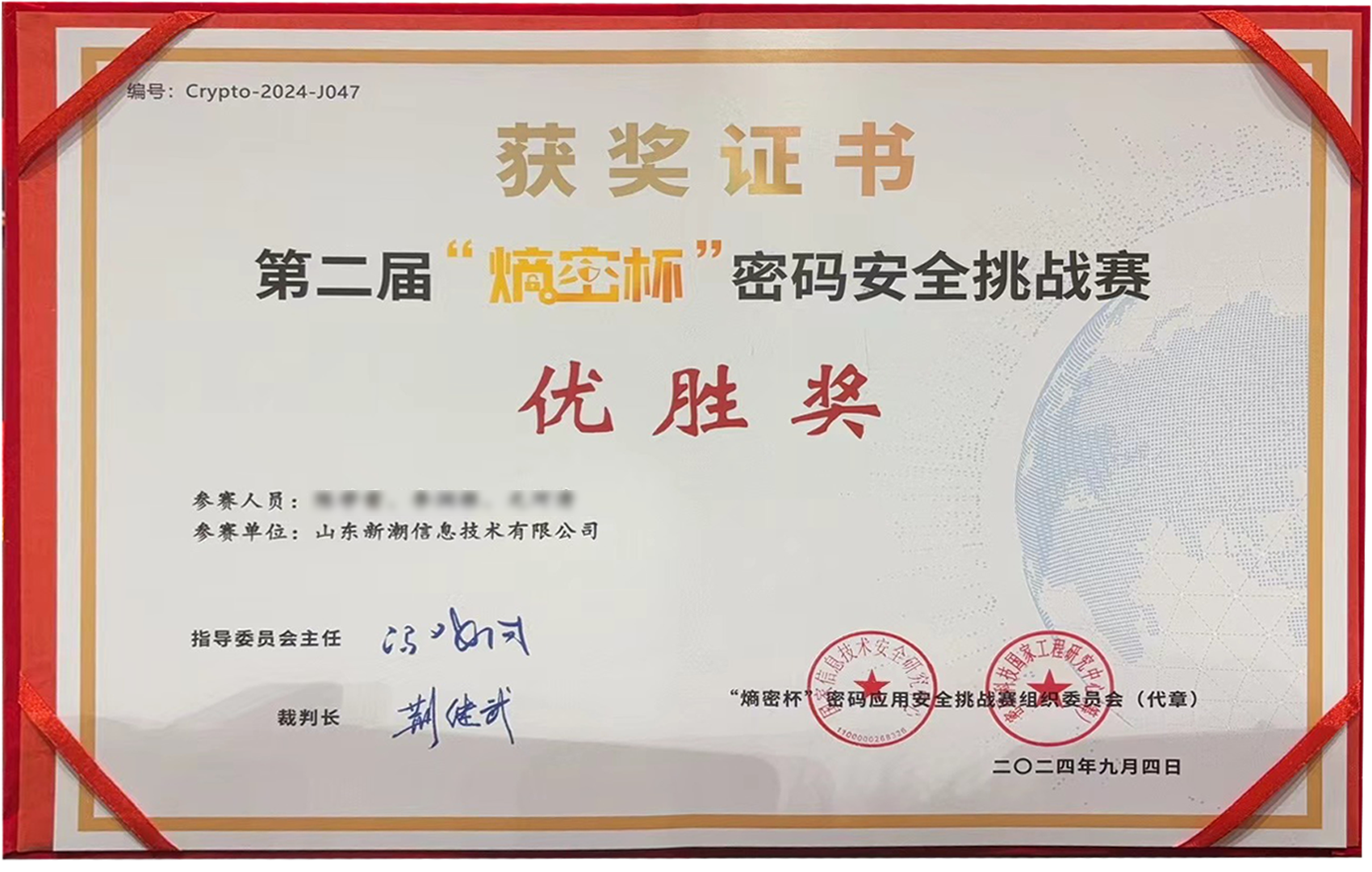 新潮信息組建的“迷蹤尋徑”戰(zhàn)隊,榮獲本次大賽的“優(yōu)勝獎”,展現(xiàn)了新潮信息在密碼領(lǐng)域的專業(yè)素養(yǎng)和綜合實力。