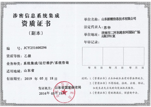 2016年5月,我公司獲得山東省保密局頒發(fā)的涉密信息信息系統(tǒng)集成資質,業(yè)務范圍包括:系統(tǒng)集成、運行維護、系統(tǒng)咨詢,此證書成為我公司發(fā)展的又一里程碑。