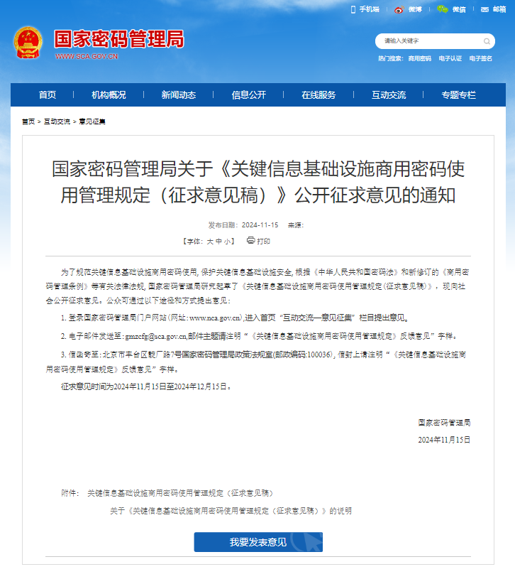 2.電子郵件發(fā)送至:gmzcfg@sca.gov.cn,郵件主題請注明“《關(guān)鍵信息基礎(chǔ)設(shè)施商用密碼使用管理規(guī)定》反饋意見”字樣。