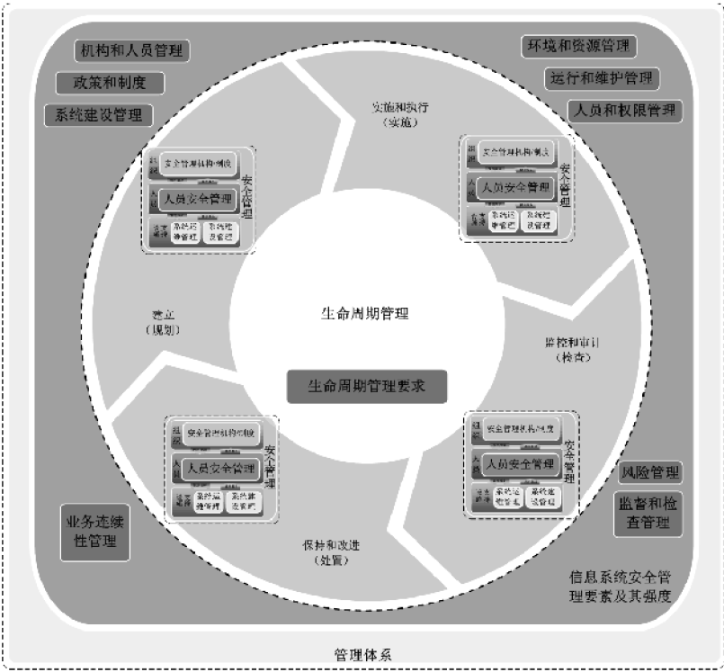 管理體系:要建成完善的安全管理體系,首先根據(jù)金融機構信息化建設進程的實際需求,逐步建立起安全管理機構、各項安全管理制度及人員配置;其次通過專職安全機構、人員對制度的執(zhí)行,提高信息安全保障能力;后續(xù)根據(jù)執(zhí)行結果檢查各項制度存在的問題和缺陷;最后依據(jù)檢查結果對制度進行改進。從而形成建立、實施和執(zhí)行、監(jiān)控和審計、保持和改進的循環(huán)過程,形成完善的管理體系。
